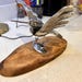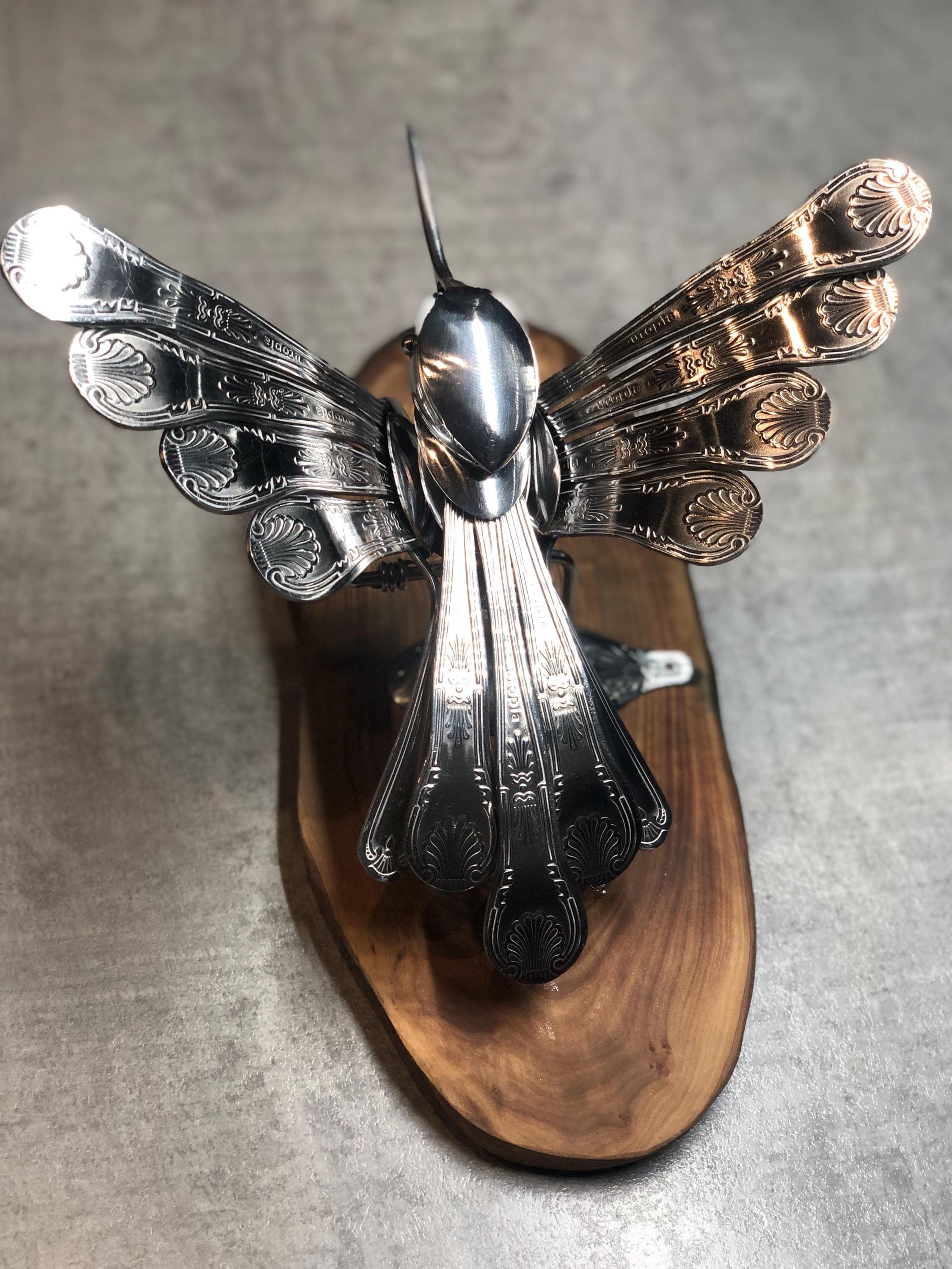 Bring delicate beauty and charm to any table or shelf with this handcrafted hummingbird, perched gracefully on an olive wood base. Made from upcycled cutlery, each piece is handmade, making it a unique and eco-friendly addition to your home.