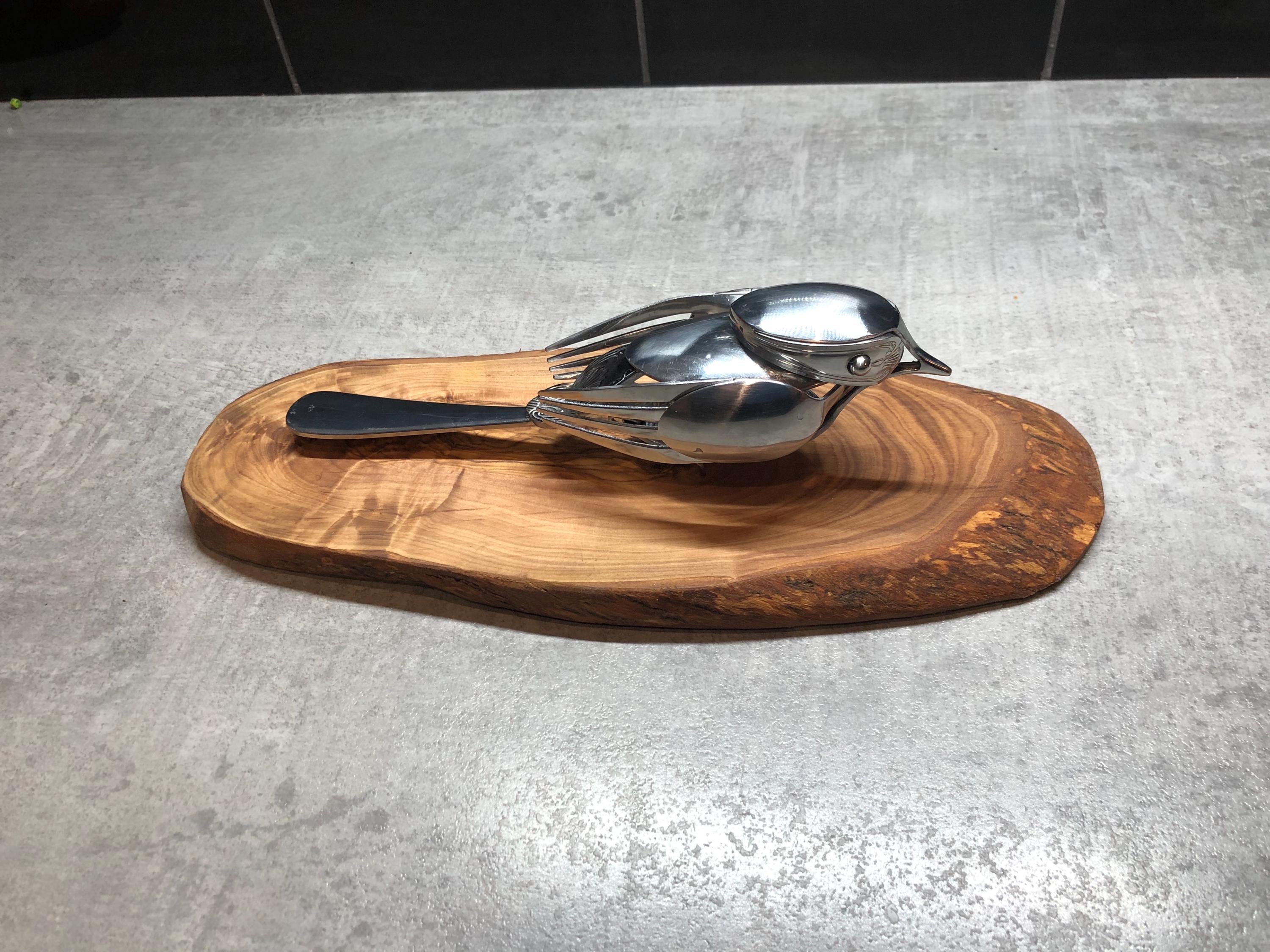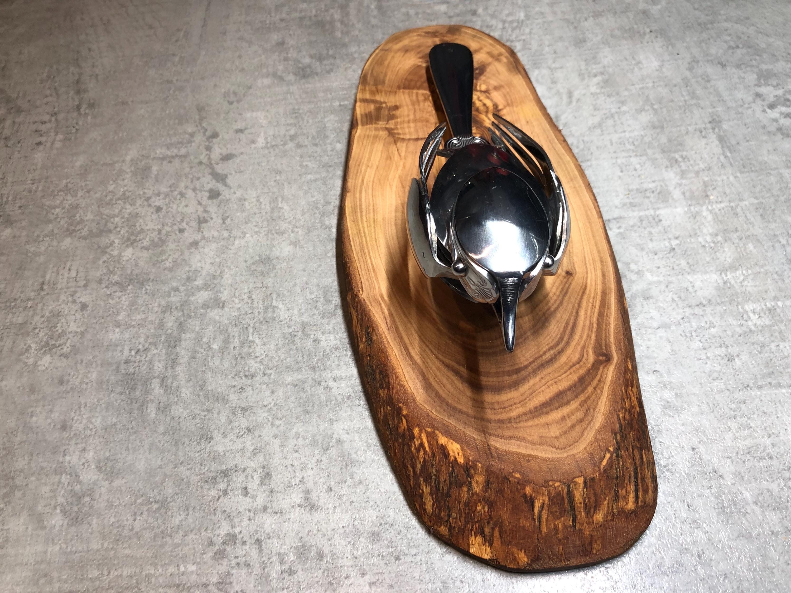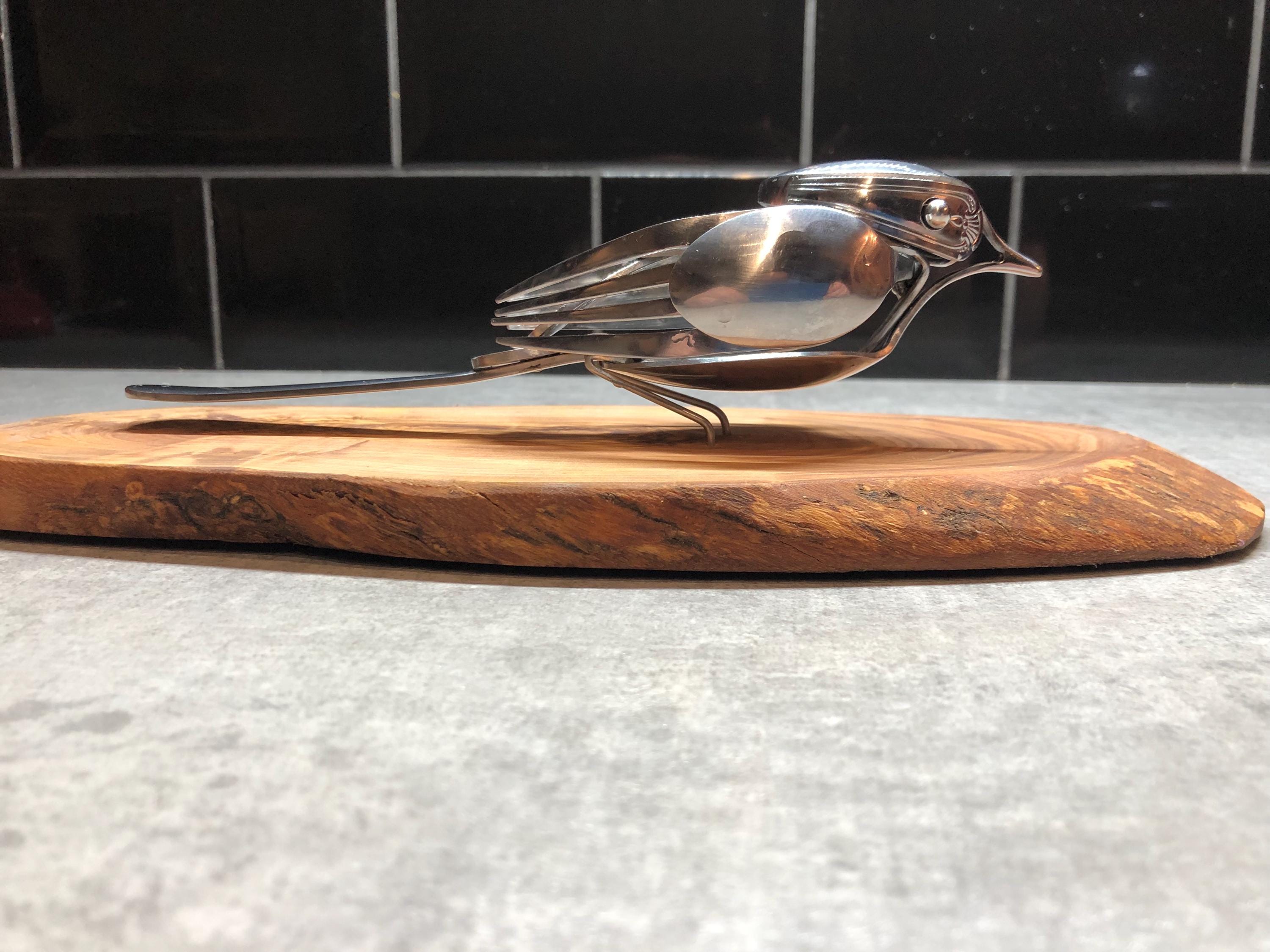 Bring a touch of whimsy and charm to your home with this unique, handcrafted bird made from upcycled cutlery, mounted on a beautiful, tabletop olive wood base. Each piece is carefully assembled by hand, making every bird one-of-a-kind.