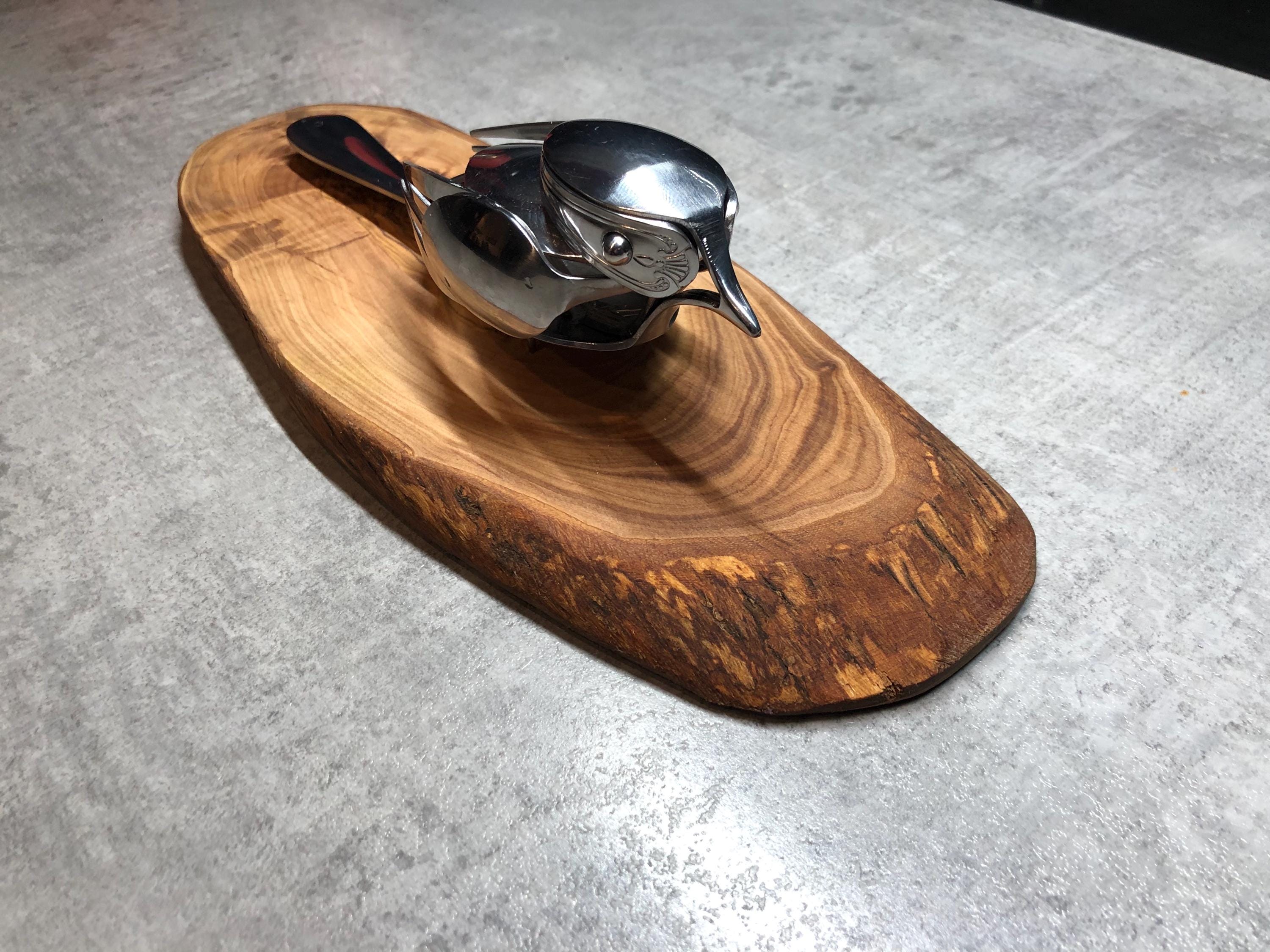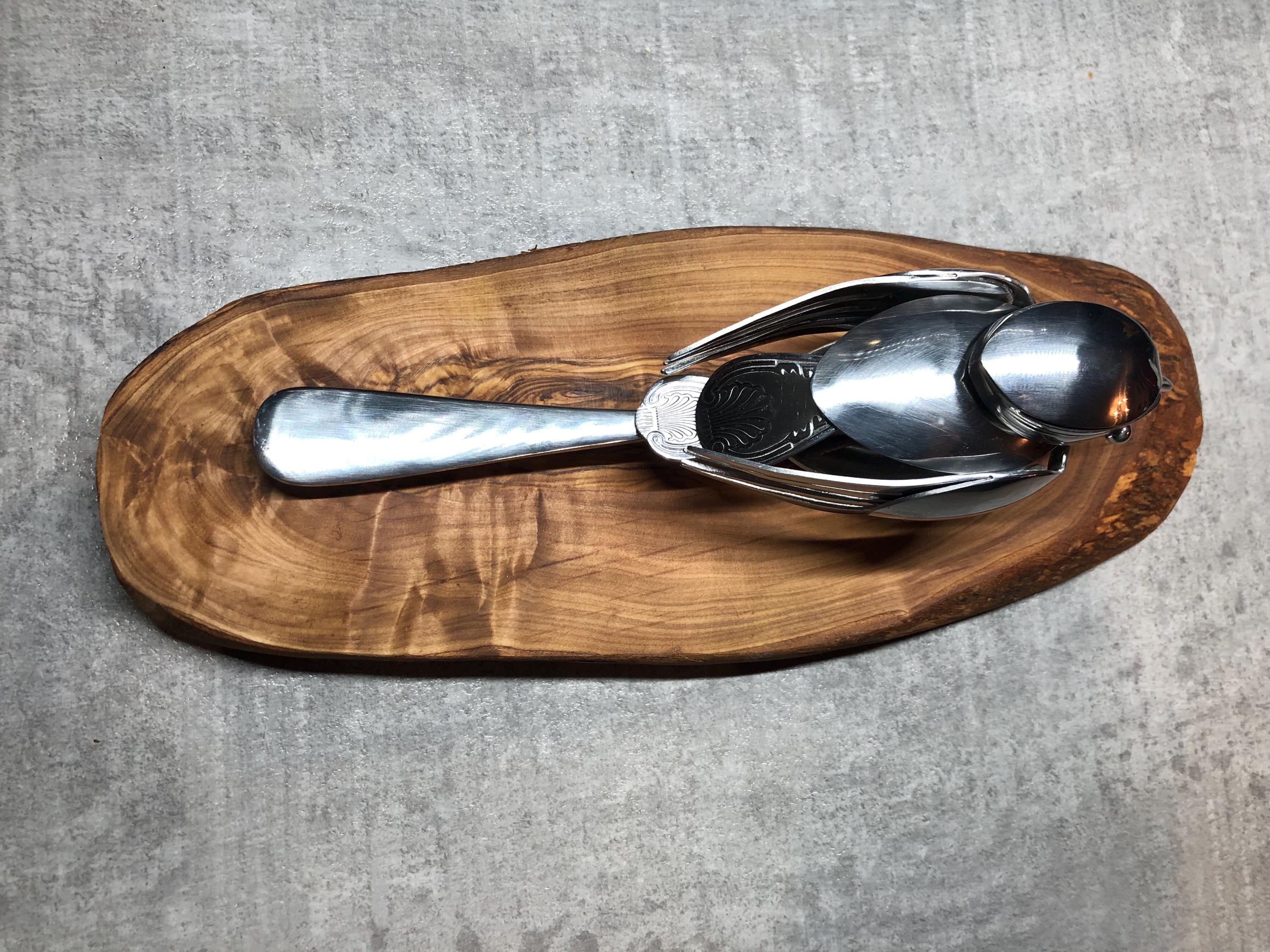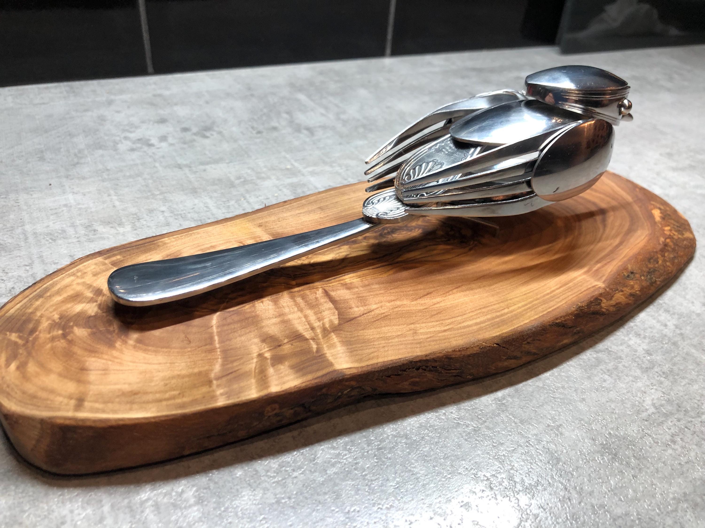 Bring a touch of whimsy and charm to your home with this unique, handcrafted bird made from upcycled cutlery, mounted on a beautiful, tabletop olive wood base. Each piece is carefully assembled by hand, making every bird one-of-a-kind.