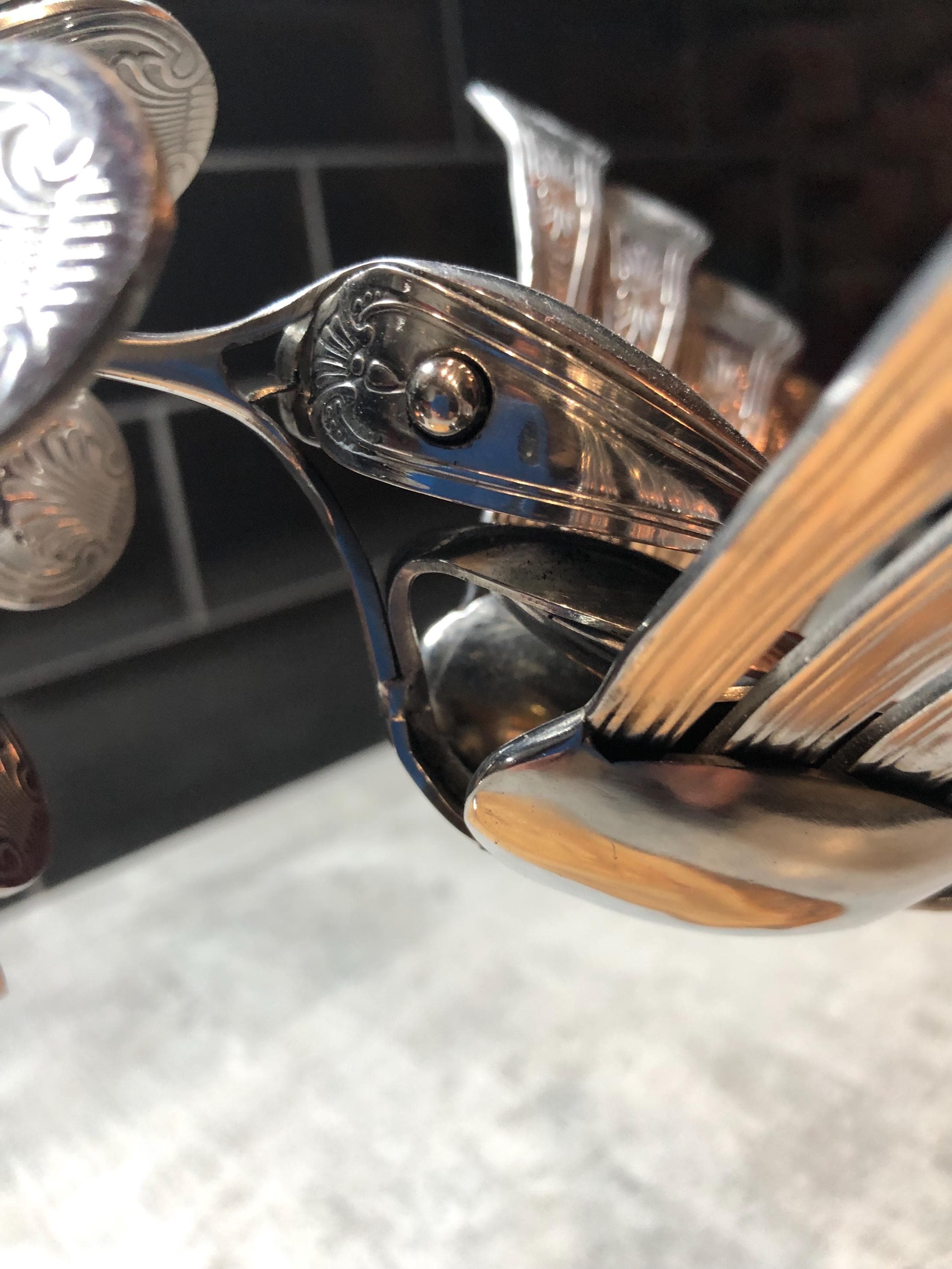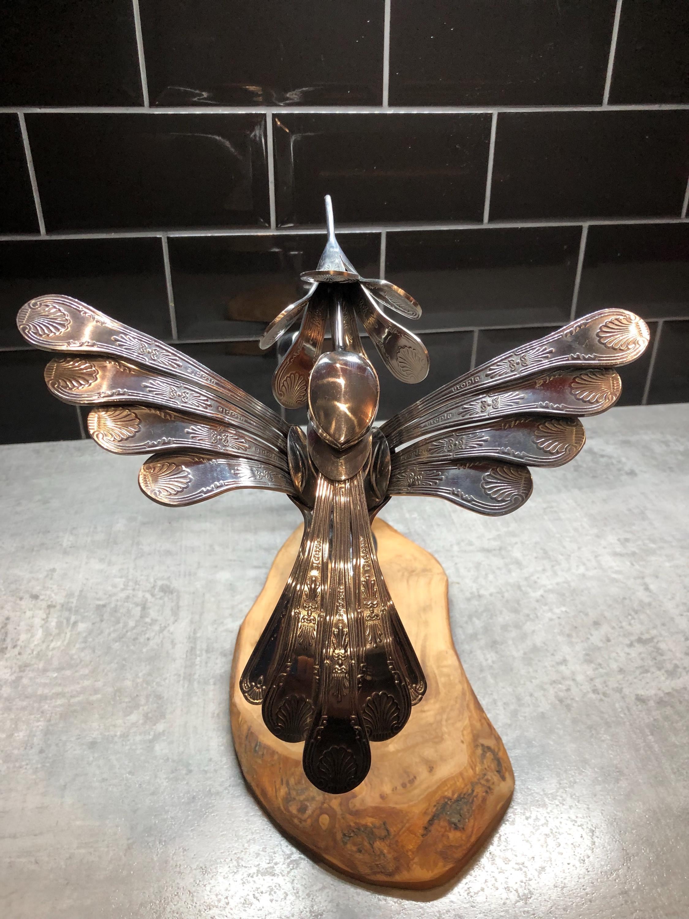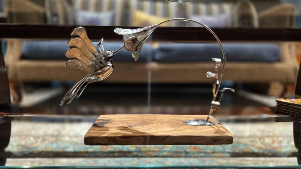 This piece was described as a beautifully crafted hummingbird made out of stainless steel spoons. It arrived fairly quickly in a bent up box, and despite the boxes appearance, the bird came safely. We set it up in our living room, underneath the glass coffee table. It's striking look brought a lot of character to our table, and the silver delightfully complimented it's surrounding area. It is a lovely centre showpiece with amazing craftsmanship and detail.