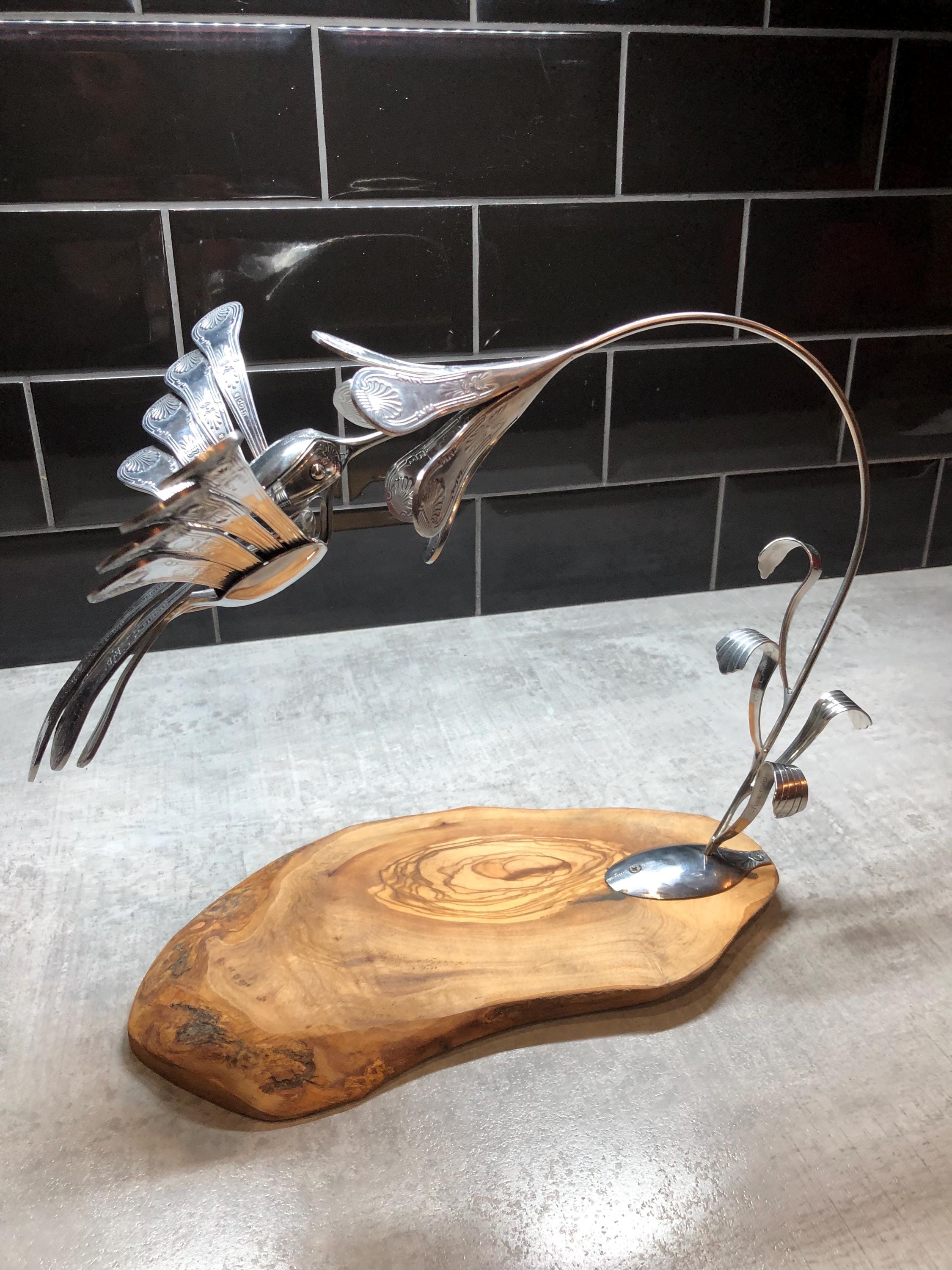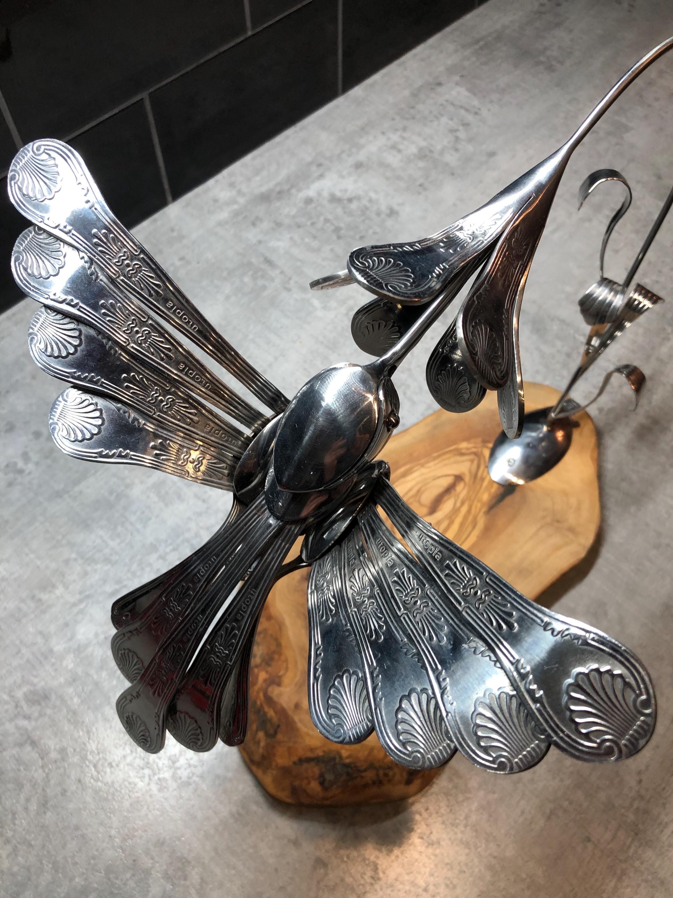 Bring nature’s beauty into your home with this exquisite, handmade sculpture featuring a hummingbird delicately perched on a blooming flower. Crafted entirely from repurposed cutlery, each piece is carefully bent and shaped by hand to create a stunning, lifelike depiction of the bird and flower. The sculpture is mounted on a natural olive wood base, adding warmth and elegance to the overall piece.